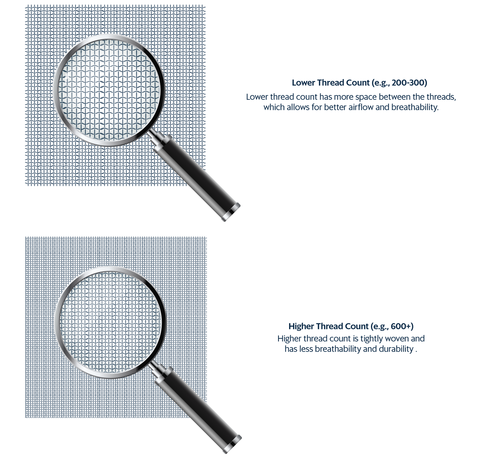 Fact: With wider spacing between threads, lower thread count sheets provide greater breathability promoting better temperature regulation and moisture evaporation for a cool, dry sleep. To ensure optimal softness, durability, and a cool sleeping environment, the thread counts of all our sheets range from 200 to 400. We prioritize quality over misleading high thread counts.